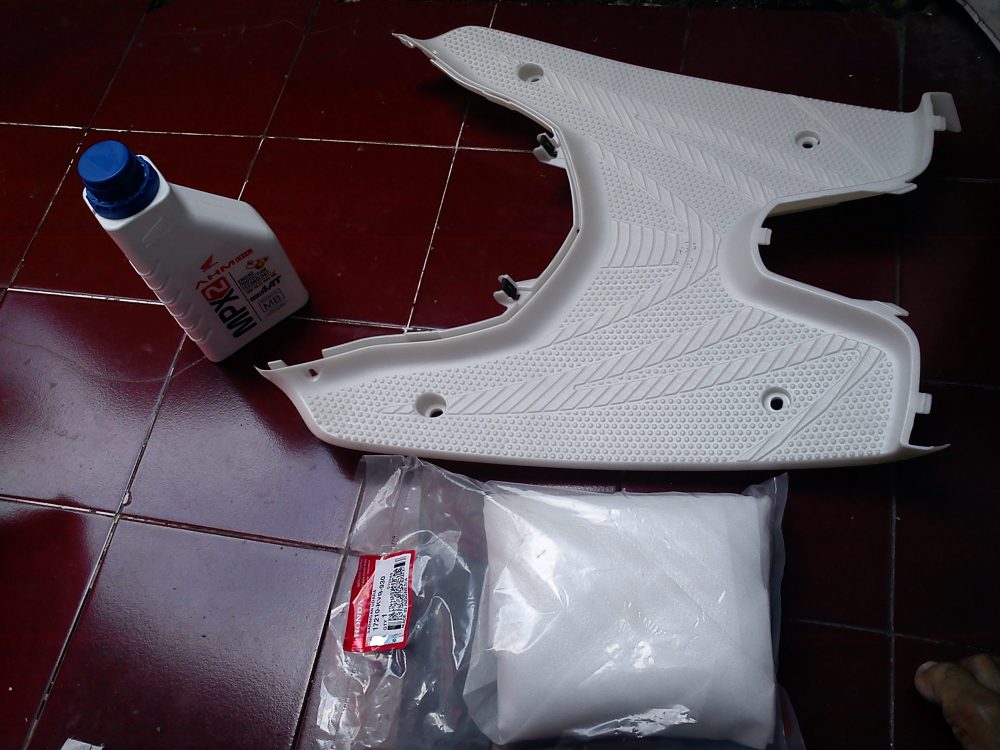 Dan malaikat penyelamat dan jodoh dengan dek putih ini datang.. ternyata seorang anak muda di samping ane kepincut dengan dek merahnya yang tinggal sebiji itu. bisik2 sama dia, motor kamu warna apa??? dia jawab hitam. gue racunin tuh dengan dek warna merah, n ternyata dia mau ambil, ok,,ok,,, kita tukeran aja nanti, kamu beli putihnya dulu, gw merah yang terlnjur di cetak fakturnya.. dan dengan senang hati dia pun mau… Alhamdulillahhhh.. Di sana juga Sekalin beli OLI MPX 2 buat ganti darah di Vario….