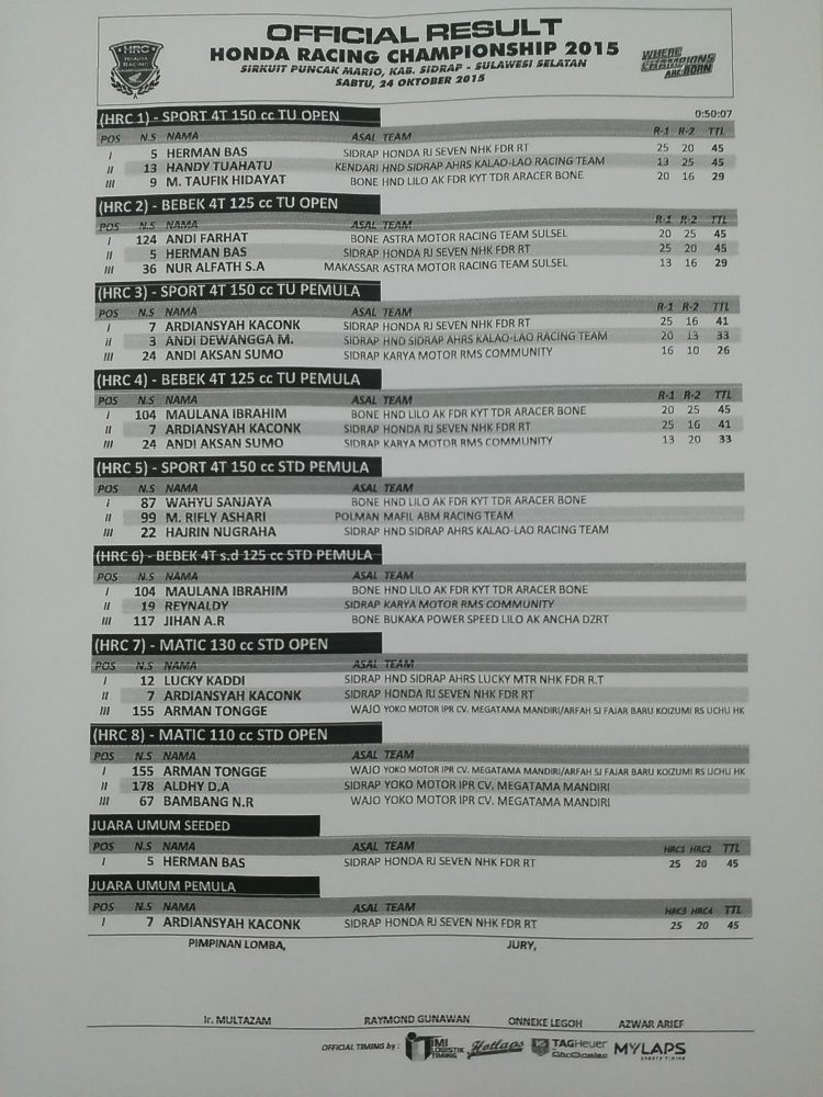 Hasil Resmi Honda Racing Champinship Sirkuit Puncak Mario Sidrap 2015