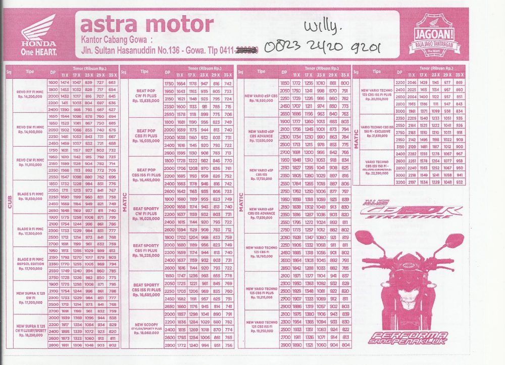 Nah, ada yang aneh nih dari brosur, ada beberapa jenis motor yang hilang, yang pertama adalah Skutik Spacy, Bebek Supra X 125 Helm in dan CBR250R. Apakah sudah tidak dijual? nanti R2M konfirmasi dulu ke AHASS Makassar.