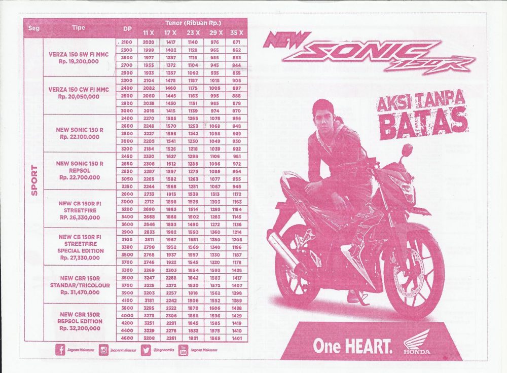 Diawal tahun ini, motor Honda di Makassar sepertinya melakukan penyesuaian harga. Seperti Honda Sonic yang ternyata sekarang sudah menyentuh ke harga 22.100.000,- Artinya ada kenaikan sebesar 5ratus ribu, dan sepertinya semua mengalami kenaikan.