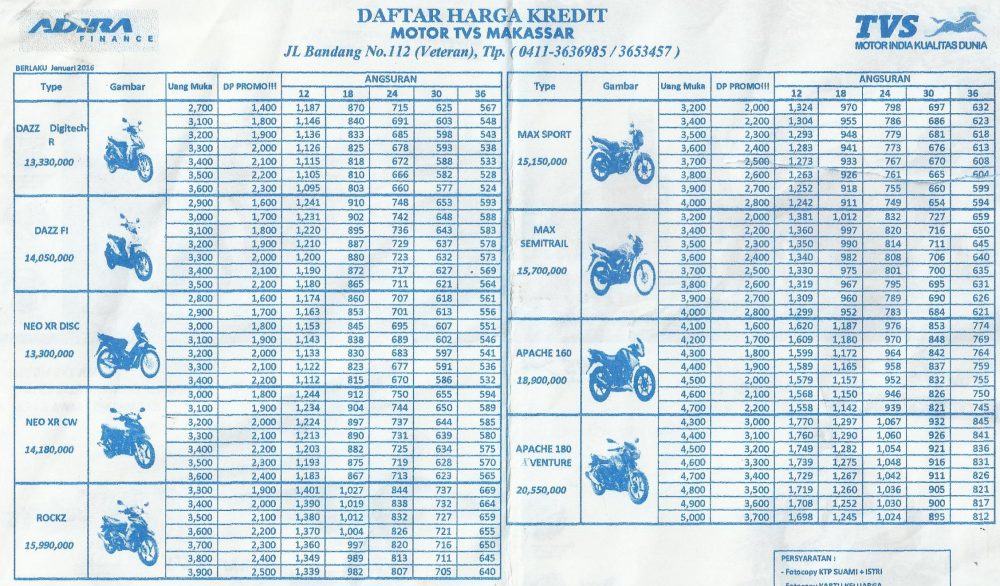 Langsung saja berikut pricelist serta simulasi kredit motor TVS di kota makassar.