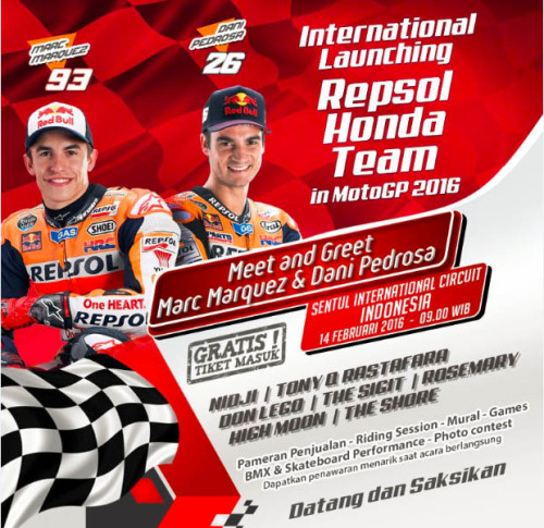 Sebelumnya sudah dikonfirmasi keduanya bakal ke Sentul Indonesia 14 Februari mendatang untuk meet and Greet buat fans, namun hari ini muncul berita terbaru dari situs honda bahwa acara tersebut adalah Lonching secara resmi Repsol Honda Team Motogp 2016. Ini kali kedua secara berturut-turut Indonesia jadi tempat lounching setelah tahun lalu yang dilaksanakan di Bali.