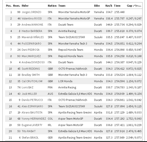 Jorge Lorenzo dan Valentino Rossi tak terkalahkan di depan, dan yang paling mengejutkan adalah duo Repsol yang harus tercecer di urutan 7 dan 8. Berkaca dari tahun lalu, Saat Free practice tidak pernah duo Honda keteteran sampai separah ini, paling di posisi 4 atau 5, jadi R2M berpendapat, musim ini akan berat Bagi Honda.