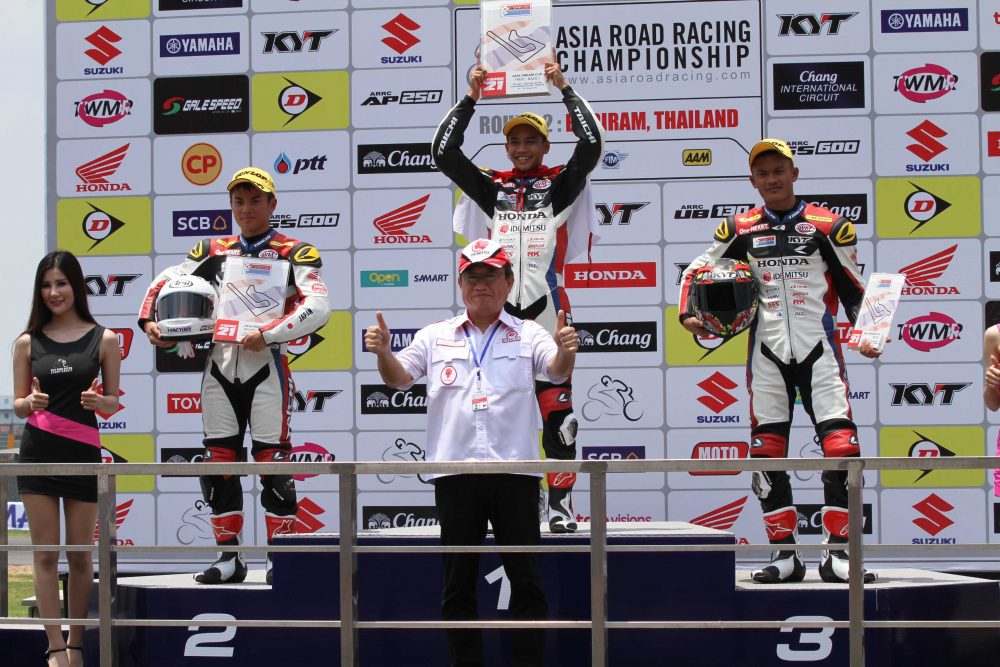 Buriram, Thailand – Lagu kebangsaaan Indonesia Raya berkumandang untuk pertama kalinya tahun ini di gelaran Asia Road Racing Championship (ARRC) seiring keberhasilan pebalap muda binaan PT Astra Honda Motor (AHM) M. Febriansyah menempati posisi tertinggi ARRC kelas Asia Dream Cup (ADC) di Chang International Circuit, Buriram, Thailand. Sang Saka Merah Putih pun berkibar di atas podium ajang balap paling bergengsi di benua Asia ini.