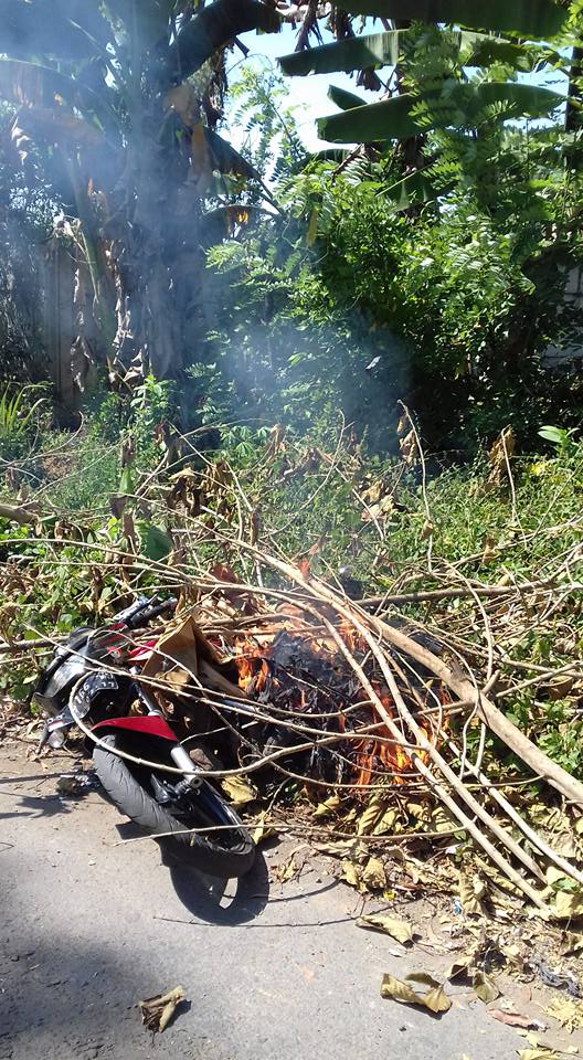 Ternyata penyebabnya sepele pemirsa, Ninja ini dibakar massa akibat sang pemilik kedapatan mencuri ayam. walahhh…… Mungkin untuk beli oli samping jadinya curi ayam deh..tuh Pelakunya, Kejadian ini berlangsung di Jalan Poros Samata Gowa Makassar tadi pagi. Adi yang sedang mengintai ayam curian ternyata sudah diintai juga oleh warga.