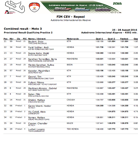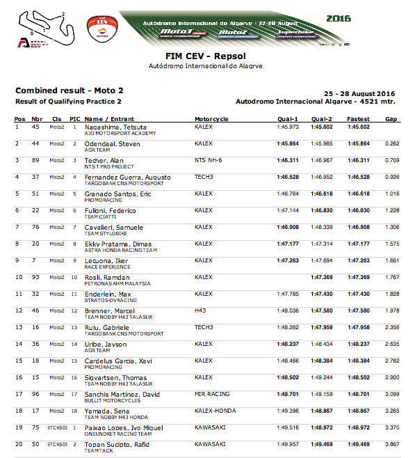 FIM CEV Portugal yang racenya akan berlangsung besok barusan sudah merilis hasil kualifikasi untuk kelas moto2 dan moto3 nya. Dimana pembalap Indonesia mewakilkan Dimas Ekky dan Rapid Topan di Moto2 dan Andi Gilang di Moto3.