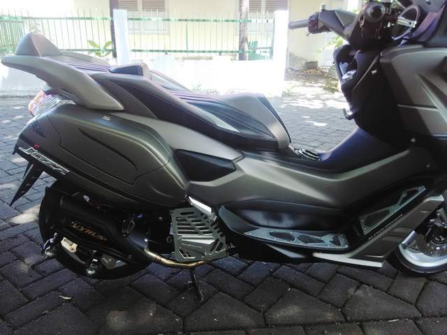 dari samping, variasi yang nempel antara lain deck custom, cover radiator, Knalpot aftermarket plus sidebox yang gagah.