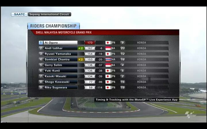 Posisi klasemen sebelum race ke 2 memang sangat dekat, Ai Ogura memimpin dengan selisih 6 point dari Andi Gilang, dan selisih 19 point dengan Yamanaka serta 20 Point dari Somkiat Chantra. Artinya ada 4 pebalap yang masih bisa memperebutkan posisi juara.