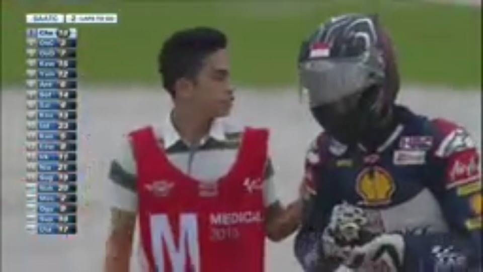 Pada posisi ini, Andi Gilang hanya butuh juara 3 untuk mengunci juara dunia dan petaka itupun muncul ketika 2 lap tersisa, kehilangan grid ban belakang membuat Andi Gilang Crash dan tidak bisa melanjutkan balapan, terlihat memegang tangan kanan sehabis jatuh.