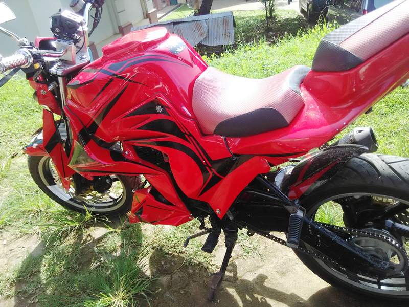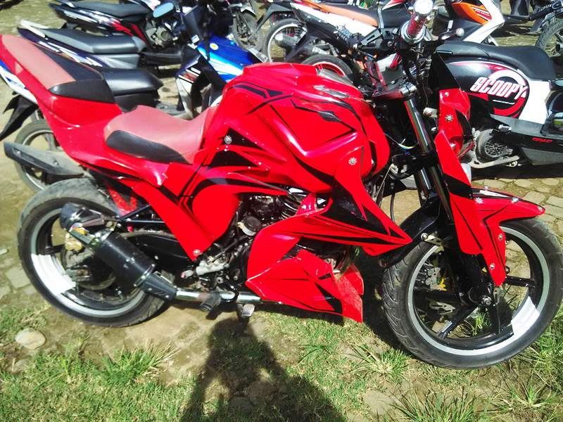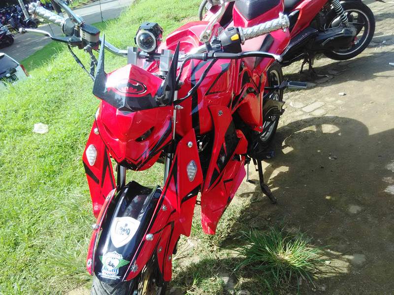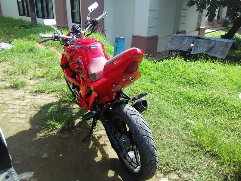 R2M sulit menganalisa aliran modif dari motor ini, cuma headlamp yang menandakan bahwa sang empunya menginginkan sosok transformer di motornya. Dengan warna dasar merah plus garis hitam, stang tinggi plus lampu tembak dan sekujur tubuh ditutupi dengan kap yang bentuknya R2M tak tahu bentuknya.