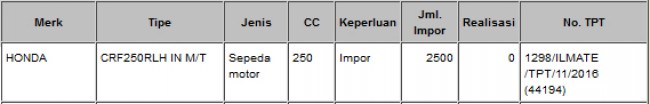 Honda akhirnya secara resmi mendaftrakan TPT Import untuk CRF250L ini sebanyak 2500 unit.