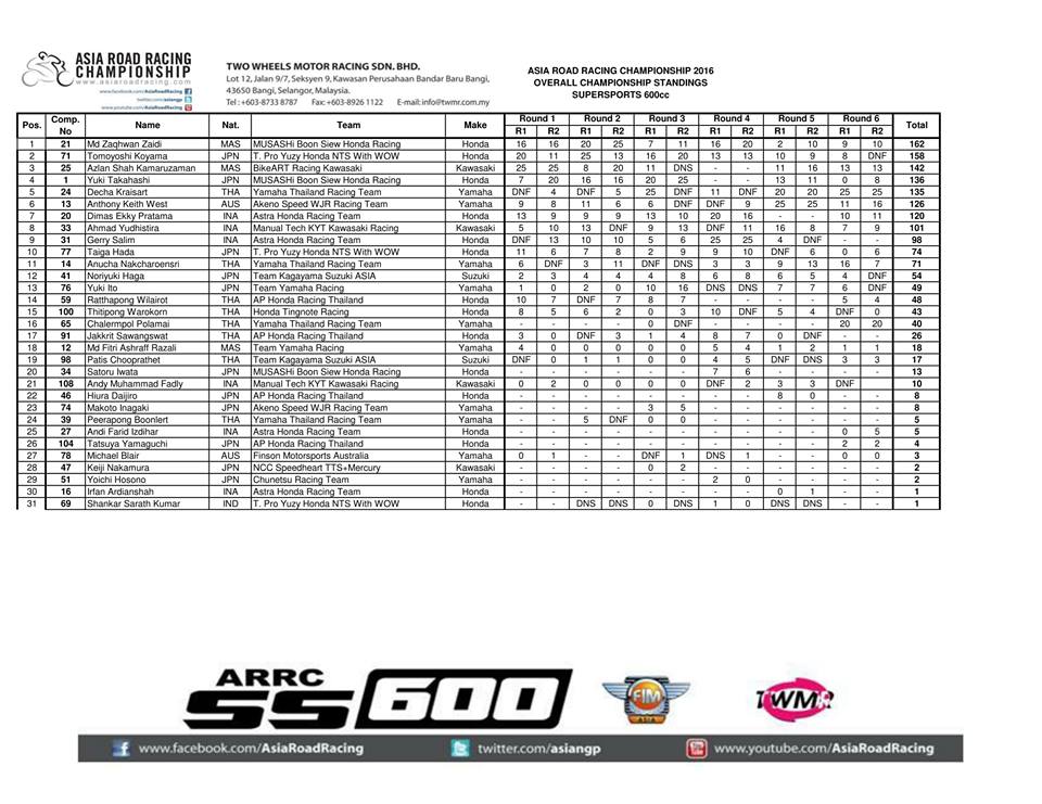 Dan kelas utama atau kelas paling bergengsi yaitu Supersport 600cc, juara umum diraih oleh Zaqhwan Zaidi dari Tim Musashi boon Siew Honda Malaysia dengan total poin 162 disusul Tomoyoshi Koyama dari tim Pro Yuzi Honda Jepang dengan 158 poin dan posisi ketiga oleh Azlan Shah dari tim BikeART kawasaki Malaysia dengan 142 poin. Pebalap Indonesia Dimas Ekky dari Astra Honda Racing Team Berhasil meraih posisi ke 7 dengan 120 point.
