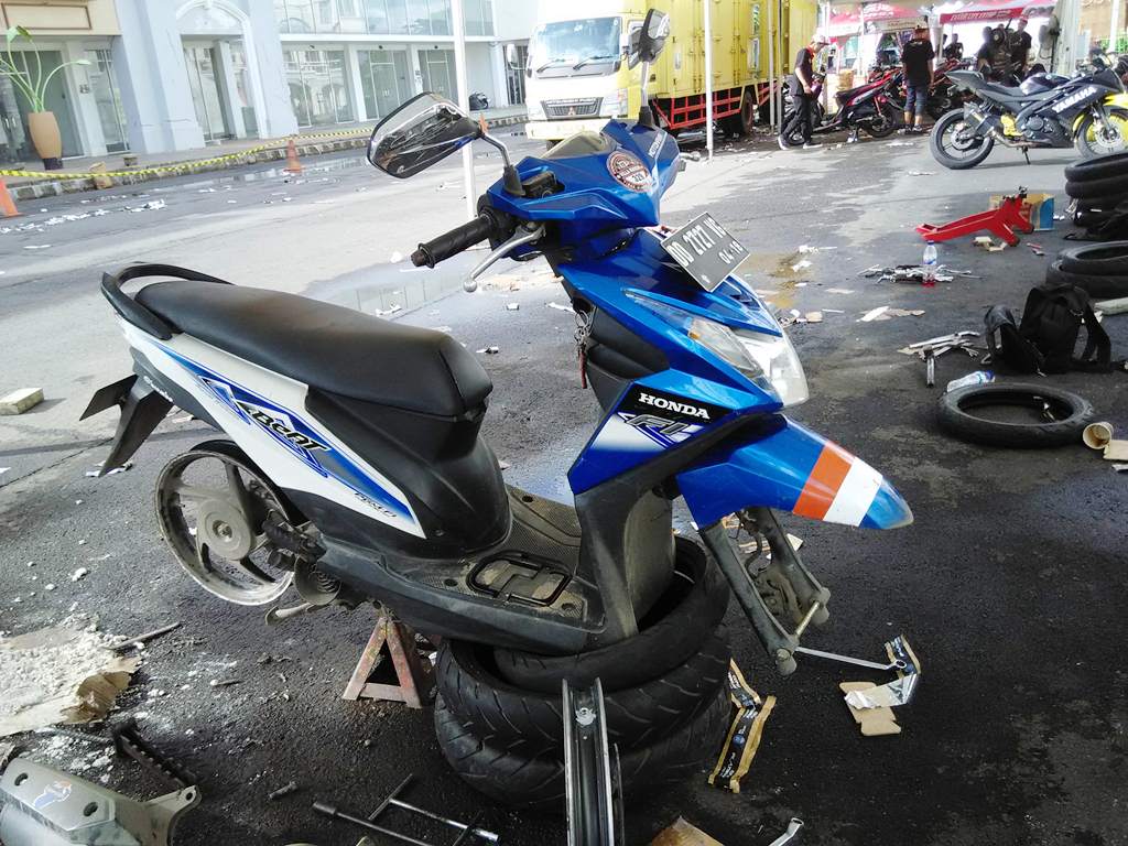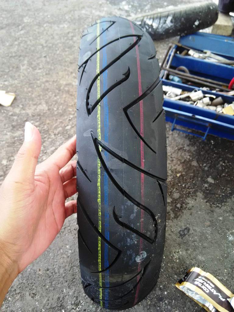 Dibongkar selama kurang lebih 20 menit tak lupa R2M memesan cairan penambal otomatis yang diharga 25.000,- plus 1 pentil untuk roda depan yang belum terpasang. Singkat cerita, terpasanglah ban Corsa Platinum seharga 250 ribu 2 biji ini di Belibis, untuk depan naik 1 step menjadi 90/80-17 dan belakang 100-80-17.