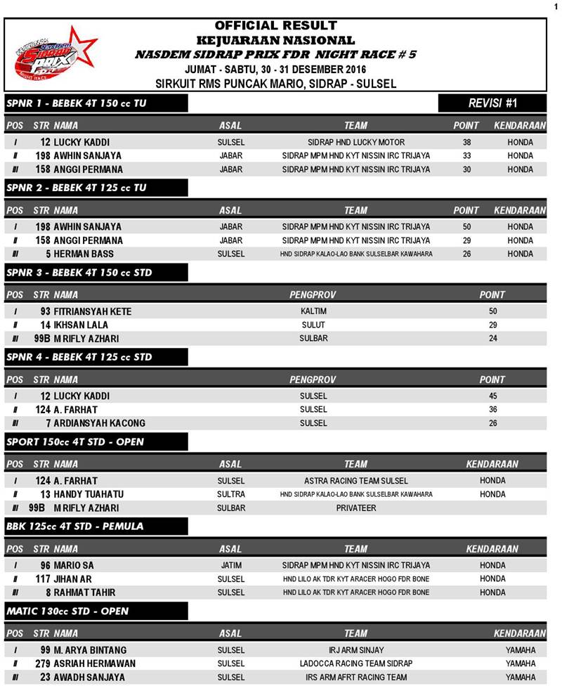 Berikut hasil race pagelaran Race dimalam Tahun baru ini.