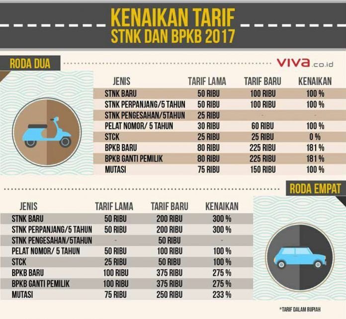 Hal lain yang mengalami kenaikan adalah mutasi kendaraan yaitu dari 75 ribu menjadi 150 ribu untuk roda 2 dan 3 serta 75 ribu menjadi 250 ribu untuk roda 4 keatas.