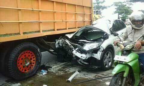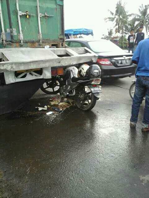 bisa dilihat bagaimana truk ini hampir mengambil sebagian badan jalan, dan yamaha Scorpion pun masuk kedalam kolong truk tersebut.