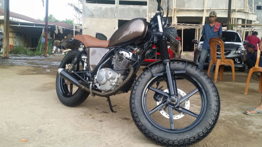 Selanjutnya motor yang kedua adalah suzuki thunder 125 yang sudah dimodifikasi beraliran japs style milik om Willy, motor kelahiran 2007 ini diubah total dengan mengganti Knalpot yang senada dengan aliran modifikasi plus Exhaust wrap sebagai penahan panas, tangki, tutup tangki serta toolbox dan jok yang dibalut warna coklat biar lebih kelihatan klasik.