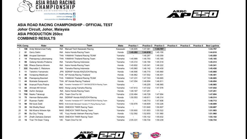 Akhirnya tes pramusim untuk kejuaraan Asia Road Race Championship tahun 2017 ini berkakhir sudah Kamis kemarin setelah 2 hari pelaksanaan dan hasil dari beberapa tim sudah bisa dilihat sekarang.