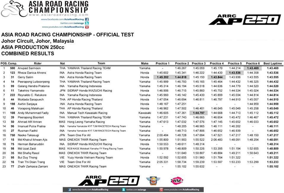 Posisi teratas diduduki oleh Anupad Sarmon dari Yamaha Thailand diikuti duo pebalap Astra Honda Racing Team Rezha Danica dan Gerry Salim. Berikut hasil Tes resmi pramusim ARRC 2017 di Johor Malaysia.