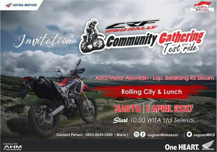 Sabtu kemarin Astra Motor Alauddin Makassar mengundangan para komunitas dan club di sekitar wilayah Makassar untuk mengikuti Community Gathering sekaligus bisa menjajal jagoan adventure terbaru dari Honda yaitu CRF250Rally.Ada banyak club yang hadir pada kegiatan kali ini antara lain Supermoto Makassar, Komunitas Trail Galesong, COC Makassar, CCM Makassar, R25 Club Makassar, Vixion Makassar dan tentunya para vlogger Makassar yang tergabung dalam Makassar Motovlog (MMV).Acara dimulai dengan rolling city yang titik start awalnya dimulai dari Astra Motor Alauddin Makassar yang kemudian dengan tertib menuju lapangan belakang RS Siloam Makassar yang sudah disiapkan sebagai arena test ride dari CRF250 Rally ini.Dengan track yang dibuat menantang ini, menggabungkan track jalan raya serta tanah, para peserta bisa dengan mudah menaklukkan track yang cukup extrim ini, dan beberapa perserta bahkan langsung kepincut untuk meminang motor berkubikasi 250 cc Injeksi ini.