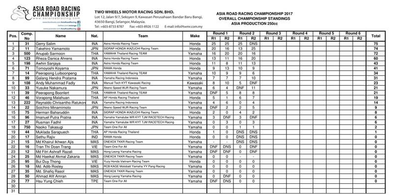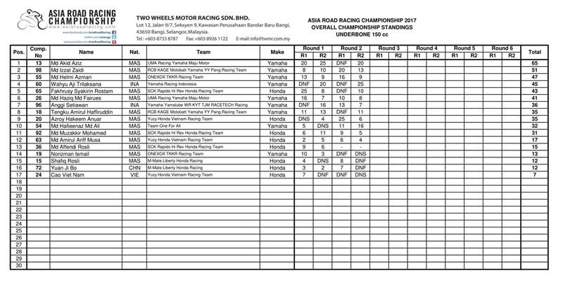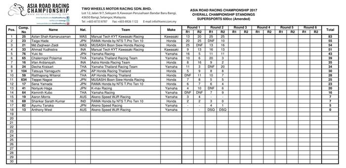 Berikut hasil lengkap dari 2 seri ARRC ini yaitu di seri pertama Johor Malaysia dan seri kedua Buriram Thailand.