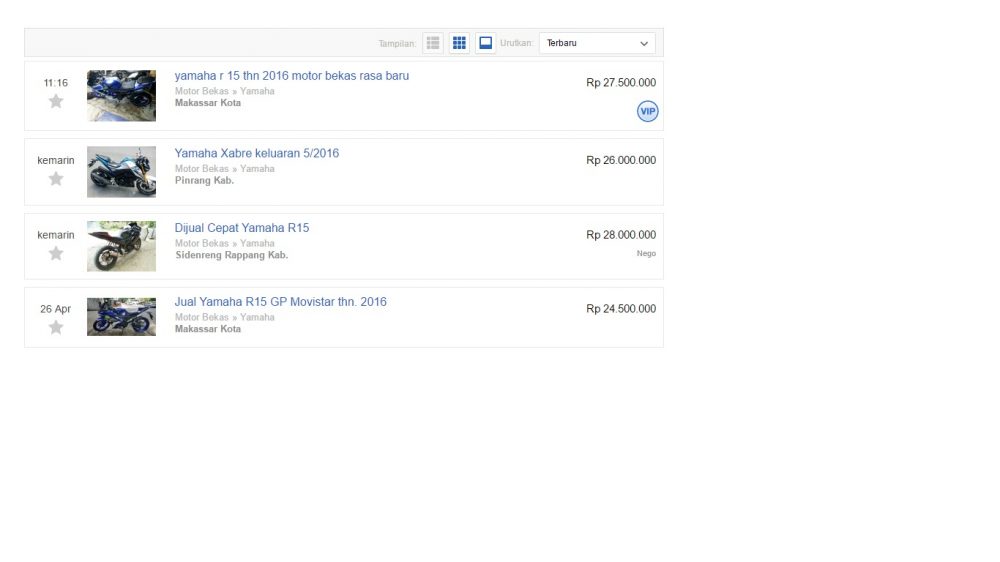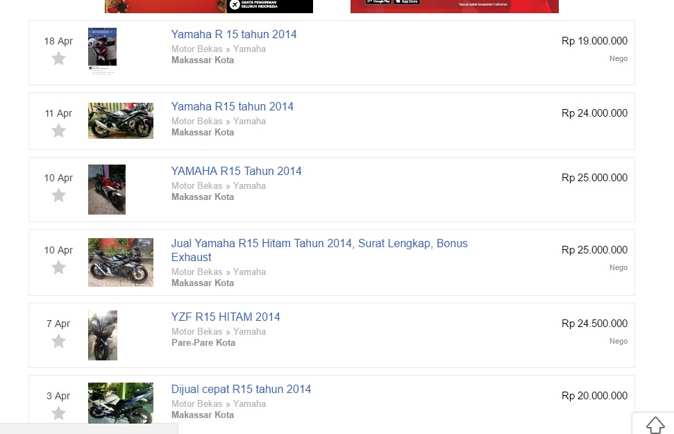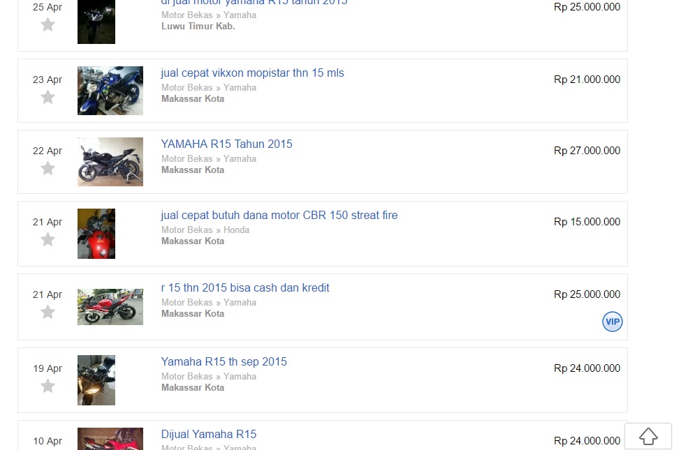 Sesuai judul, kira-kira berapakah harga seken dari R15 lama ini pasca kehadiran R15 baru dengan mesin VVA ini, berikut beberapa data harga yang R2M himpun dari situs jual beli dan lokasi merupakan daerah asal R2M yaitu Makassar. Untuk tahun kemarin atau 2016 sebgai tahun produksi terakhir, Yamaha R15 masih bertengger di harga 25-27jutaan, yup, masih cukup mahal dengan usia motor yang mungkin ada yang belum setahun.