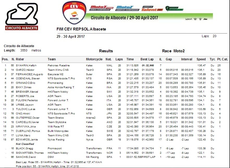 Berikut hasil lengkap seri pertama FIM CEV Repsol Albacete Spanyol 2017.
