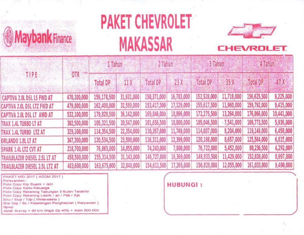Dari banyak model Chevrolet, yang dipasarkan di Makassar sendiri antara lain Captiva, Trax, Orlando, Spark dan Trailblazer. Berikut harga dan simulasi dari kesemua lineup Chevrolet Makassar ini.