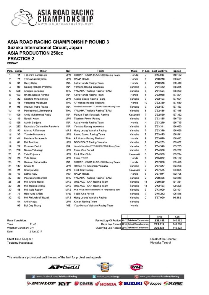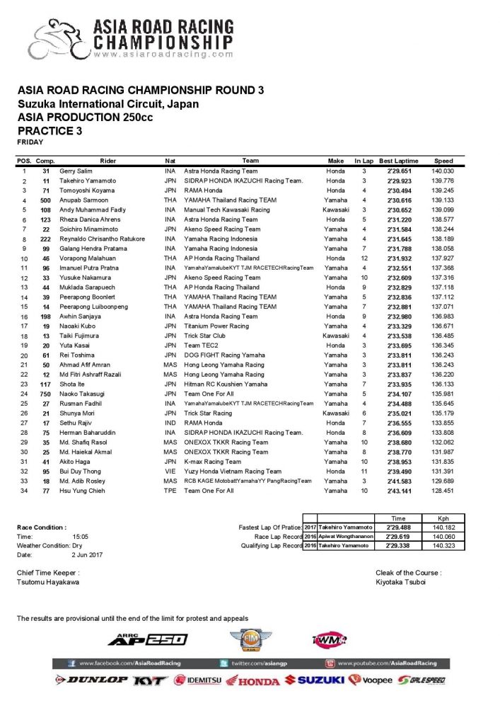 Seri ketiga dari ajang balap Asia yaitu Asia Road Race Championship (ARRC) kali ini akan menyambangi negeri Sakura Jepang (2-4 Juni 2017) sebagai tuan rumah dan jum’at kemarin beberapa kelas telah melaksanakan latihan bebas atau free practice sebelum sesi kualifikasi sabtu ini.
