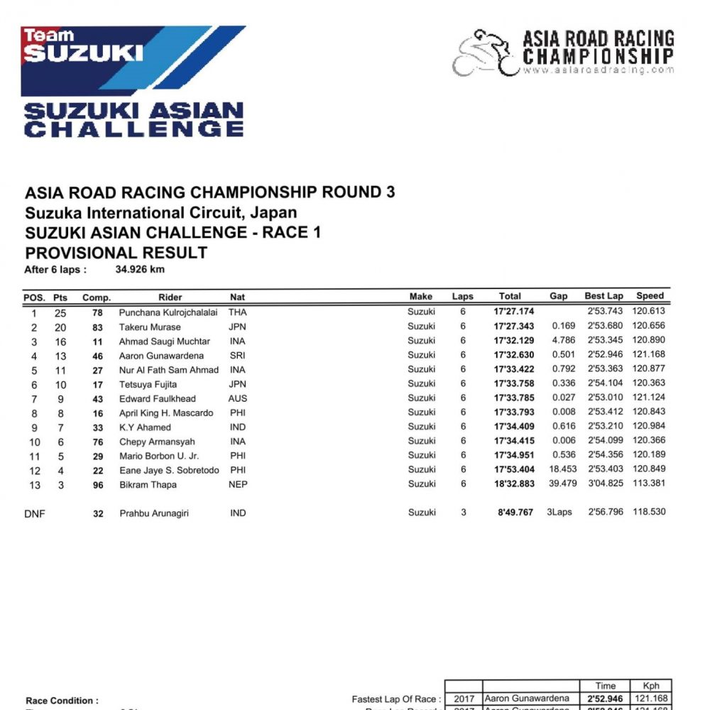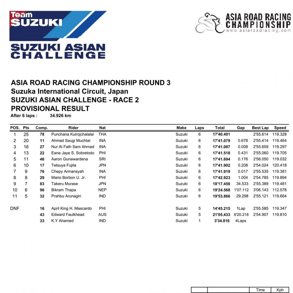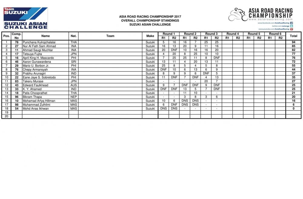 Adapun posisi klasemen sementara untuk kelas Suzuki Asian Challenge ini langsung dipimpin oleh  Punchana Kulrojchalalai dari Thailand berkat double podium 1 kali ini kemudian diikuti oleh Nur Alfath diposisi kedua dan Ahmad Saugi di posisi ketiga.