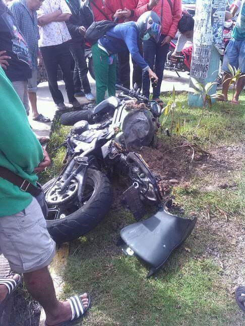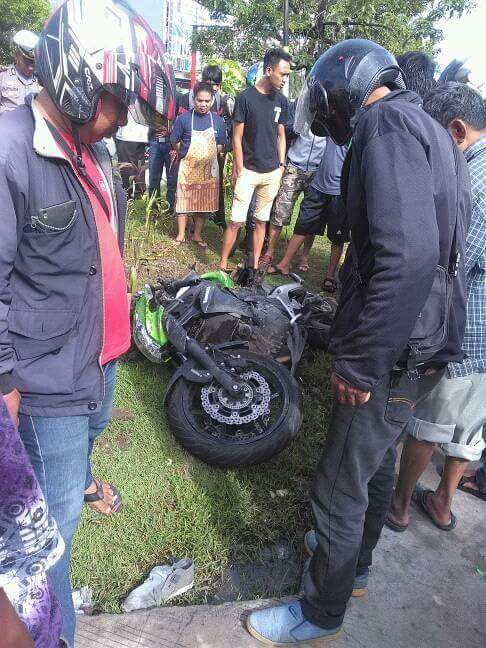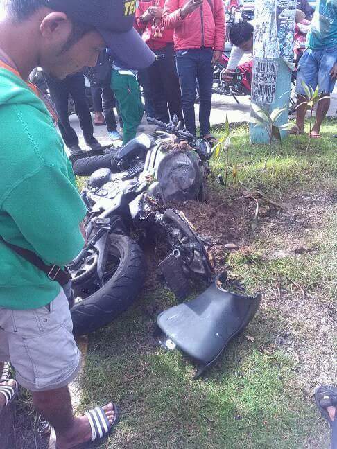 Nasib yang tidak mengenakkan bagi rider Kawasaki ER6N di Makassar ini, akibat menabrak trotoar dan disinyalir mengakibatkan bensin tumpah ditambah percikan api akibat gesekan hingga terjadilah kebakaran itu.