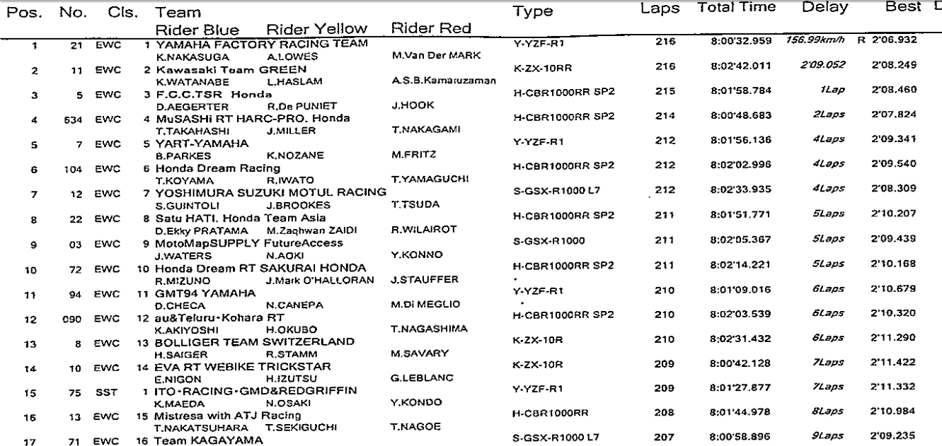 Dari hasil race yang telah dikeluarkan oleh FIM EWC akhirnya menghantarkan Yamaha Factory Racing Team dengan motor Yamaha YZF-R1 yang diwakili oleh K. Nakasuga, A. Lowes dan M. Van De Mark berhasil meraih posisi pertama dengan total lap sebanyak 216, disusul dari pabrikan ijo kawasaki dengan motor Kawasaki ZX10RR dengan pebalap K. Watanabe, L.Haslam dan Azlanshah Kamruzzaman dengan total lap sebanyak 216.