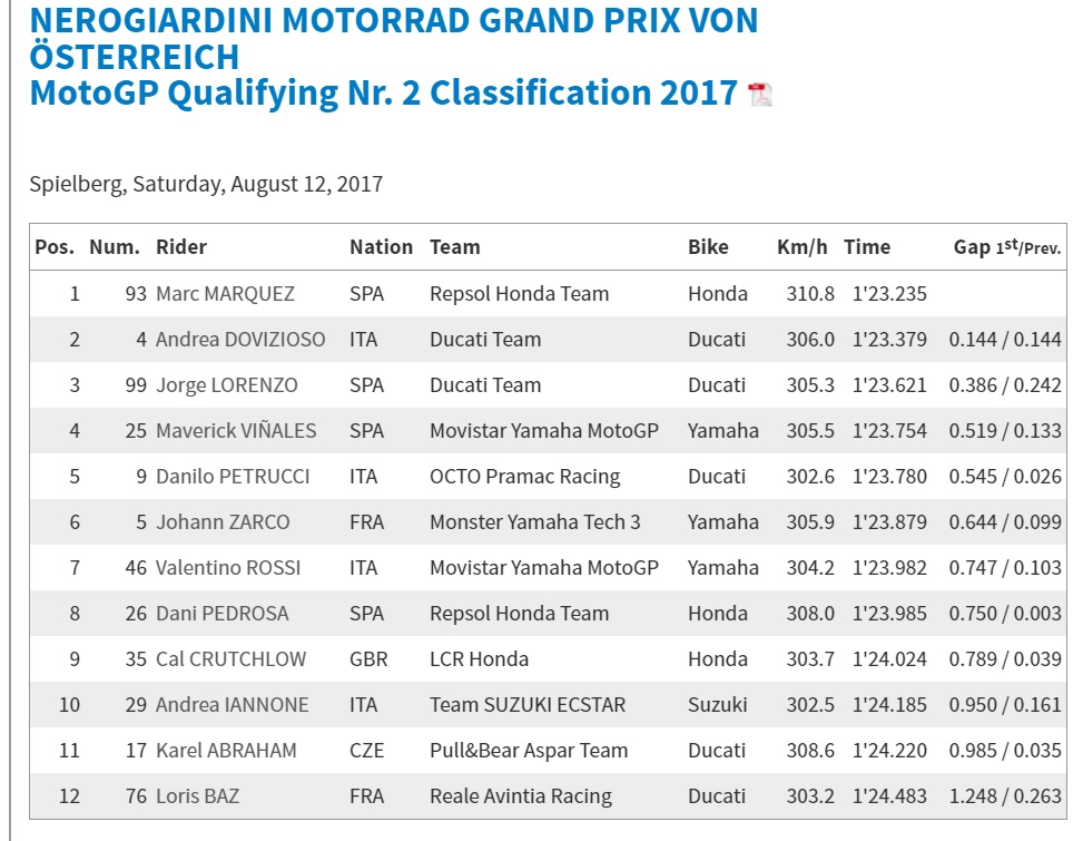 Barusan telah usai sesi kualifikasi kedua atu kualifikasi terakhir dari pagelaran MotoGP seri ke 11 di sirkuit NEROGIARDINI MOTORRAD GRAND PRIX VON ÖSTERREICH Austria 2017.