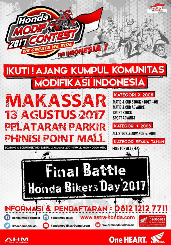 Manager Marketing Astra Motor Makassar, Henry Setiawan, mengatakan perubahan konsep acara dan kelas yang dilombakan merupakan inisiatif AHM sebagai pabrikan untuk mengakomodir perkembangan trend modifikator namun tetap layak dan aman dikendarai, Final Battle sebagai puncak acara kompetisi modifikasi ini akan dilangsung pada Oktober 2017 di ajang Honda Bikers Day (HBD) Nasional di Yogjakarta.