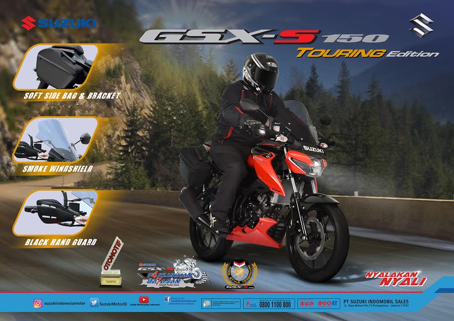 Tak cukup sampai disitu, di ajang Jakarta Fair 2017 kemarin, kembali PT. SIS menambah varian GSX S 150 yang diupgrade menggunakan windshild serta sidebag yaitu GSX S 150 touring Version.
