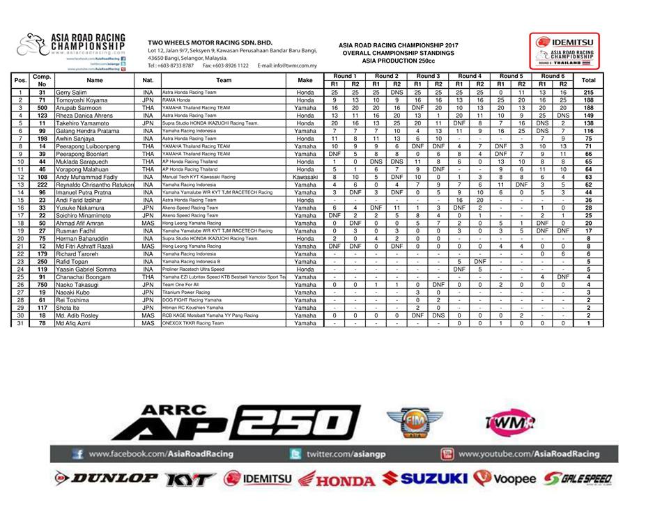 Raihan point untuk juara umum sudah ditentukan oleh Gerry Salim semenjak race Pertama di Sirkuit Chang International Thailand yang berhasil meraih posisi ke 4 dan langsung mengunci juara ARRC untuk kelas AP. 250, kemudian para race kedua Minggu kemarin yang sudah tanpa beban apapun, Gerry salim berhasil mempecundangi pebalap Wanita Thailand Muklada Sarapuech yang juga ngotot untuk naik podium di race pamungkas 2017.