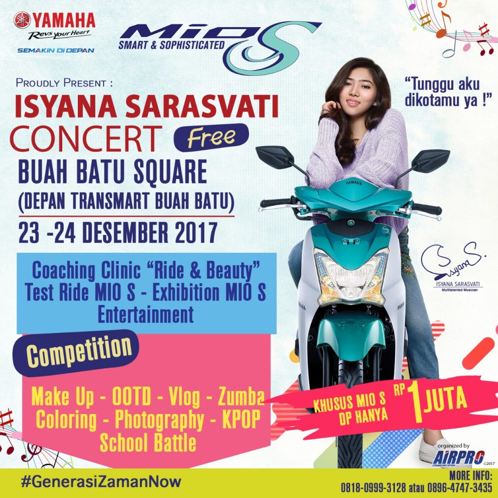 Jangan sampai lewatkan keseruan acara ini karena akan ada Coaching Clinic “Ride & Beauty” agar kamu perempuan Bandung tetap cantik saat berkendara. Kalian juga bisa melakukan test ride Mio S untuk merasakan sensasi berkendara yang jelas beda. Serta dapatkan promo menarik serta special gift langsung dari Isyana setiap pembelian pembelian Mio S dan masih banyak hadiah lainnya menanti kamu semua. Kalian juga bisa menikmati beragam kuliner khas Bandung hanya di booth Yamaha.