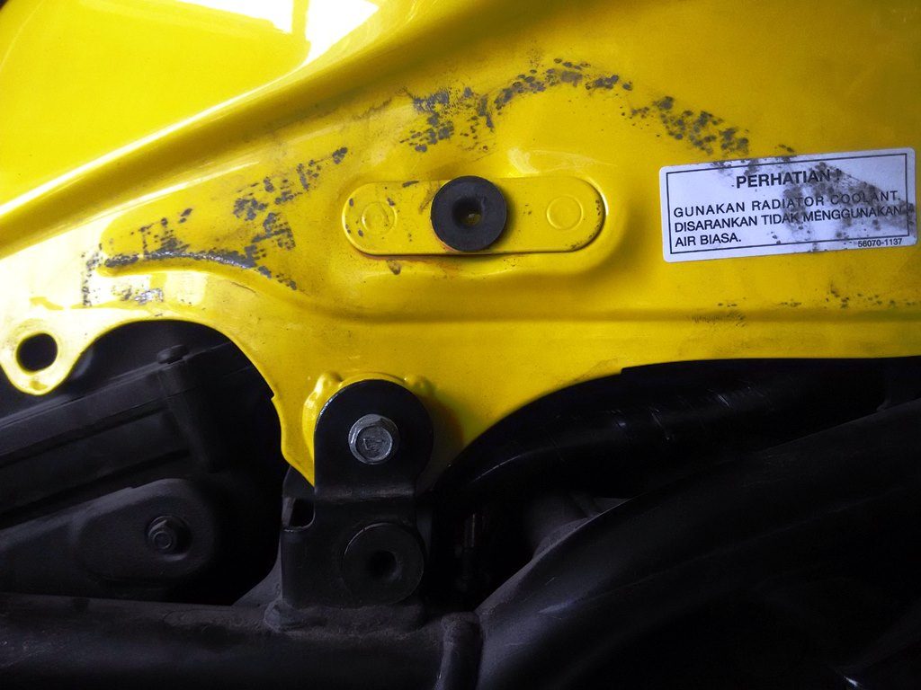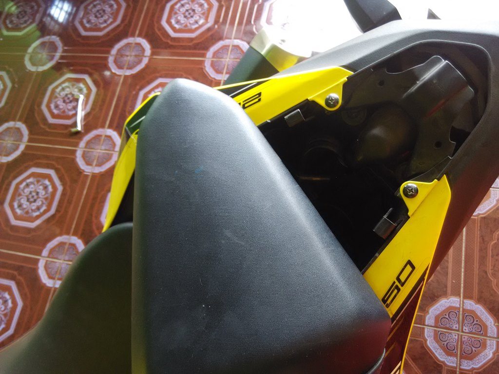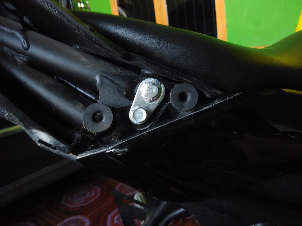 Setelah terbuka maka kita akan mendapatkan baut 10 yang merupakan pengait jok depan, jadi otomatis buka jok depan harus melalui langkah diatas, beda dengan suzuki GSX 150 yang langsung bisa dibuka dengan melipat sedikit joknya.
