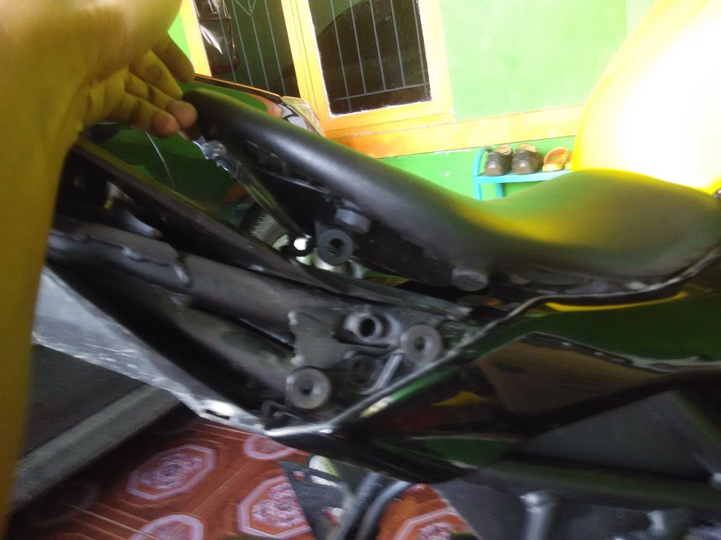 Pertama-tama, urutannya adalah dari belakang atau buntut dengan membuka jok boncengan yang dilanjutkan dengan membuka 2 baut dibawah jok.