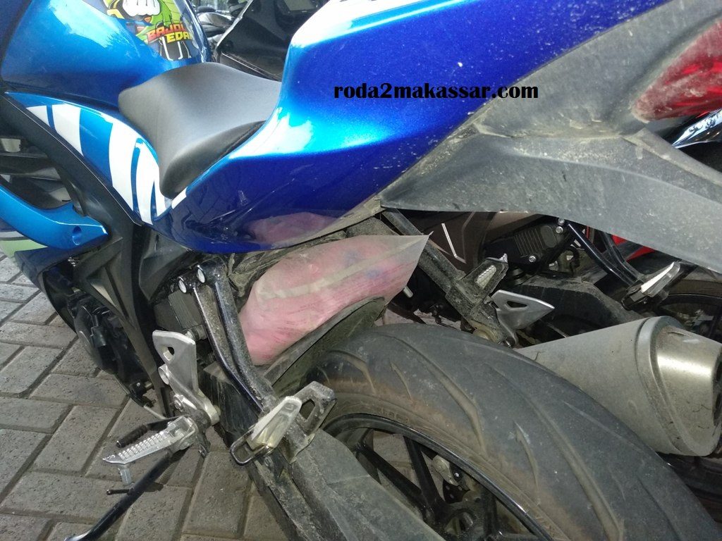 Apakah itu? kita tahu bersama bahwa tempat penyimpanan barang di Suzuki GSX 150 R/S itu hanya ada dibawah jok boncengan itupun sangat kecil dan hanya memuat sedikit toolkit dan lap kanebo, itupun sudah sempit sekali, namun bukan anak muda jika tak kreatif, ada 1 tempat penyimpanan barang yang sangat-sangat bermanfaat dan tergolong aman yaitu didepan roda belakang antara bodi motor dengan spakbor belakang, berikut penampakannya.