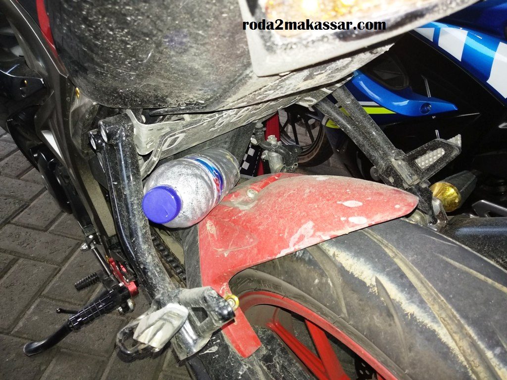 Diapit oleh stand kaki boncengan, memang tempat ini tergolong aman, bahkan botol air mineral pun tidak akan jatuh dan ini terbukti ketika touring sejauh hampir 800km, tak ada insiden botol mineral yang ditempatkan dibagian ini yang jatuh.
