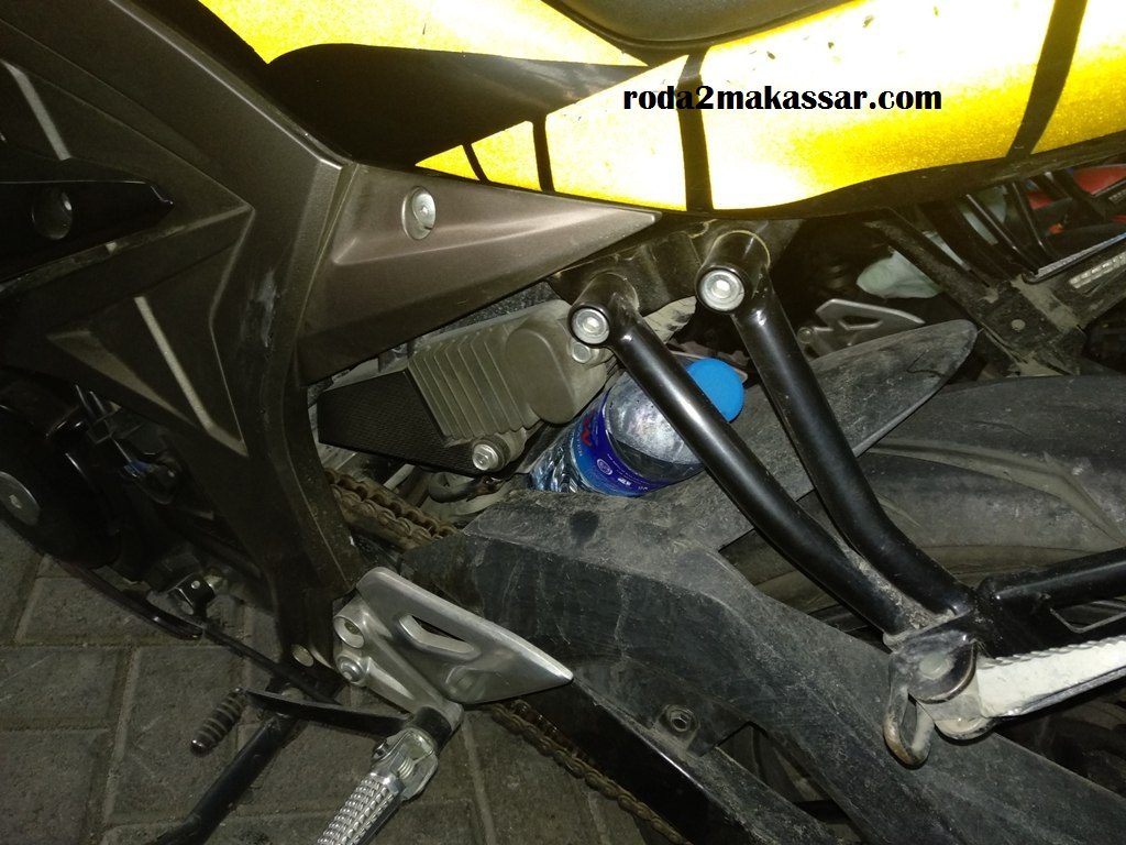 Diapit oleh stand kaki boncengan, memang tempat ini tergolong aman, bahkan botol air mineral pun tidak akan jatuh dan ini terbukti ketika touring sejauh hampir 800km, tak ada insiden botol mineral yang ditempatkan dibagian ini yang jatuh.