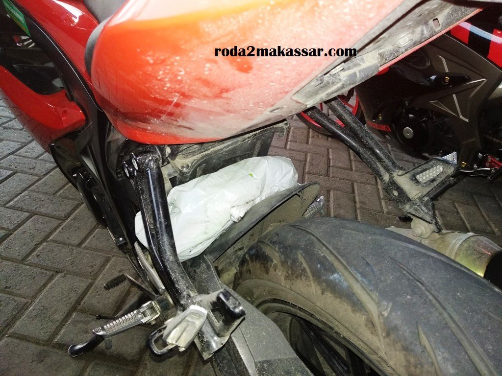 Apakah itu? kita tahu bersama bahwa tempat penyimpanan barang di Suzuki GSX 150 R/S itu hanya ada dibawah jok boncengan itupun sangat kecil dan hanya memuat sedikit toolkit dan lap kanebo, itupun sudah sempit sekali, namun bukan anak muda jika tak kreatif, ada 1 tempat penyimpanan barang yang sangat-sangat bermanfaat dan tergolong aman yaitu didepan roda belakang antara bodi motor dengan spakbor belakang, berikut penampakannya.