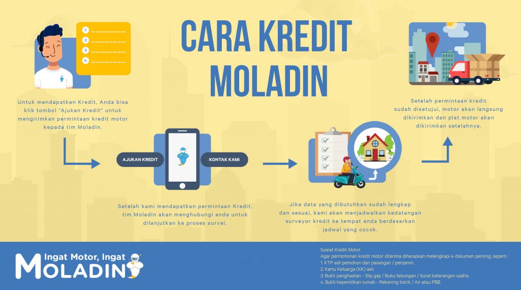 Kemudahan Pembelian Motor adalah Pelayanan Utama, Jika sebelumnya pembelian motor masih menggunakan cara konvensional, yakni dengan cara datang ke dealer langsung, kini membeli motor dapat dilakukan hanya dengan kedua jempol saja. Konsumen diajak untuk merasakan magical experiences dengan hanya cukup buka aplikasi atau website Moladin untuk membeli motornya, Konsumen akan dihubungi oleh Customer Service untuk proses verifikasi pemesanan dan lanjut ke tahap berikutnya. SIlahkan lihat tahapan cara kredit Moladin di bawah ini.
