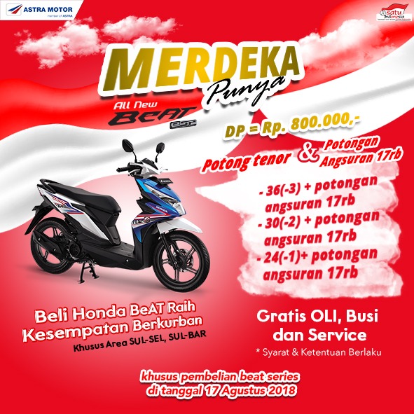 Roda2Makassar.com – Dalam rangka memperingati bulan kemerdekaan Indonesia, Astra Motor Makassar sebagai main dealer sepeda motor Honda untuk wilayah SulSelBarTra dan Ambon memberikan program spesial kemerdekaan yang menarik untuk pelanggan.
