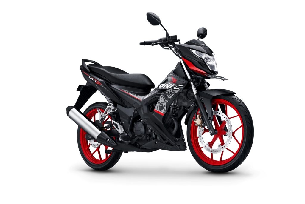 Agresivitas baru Honda Sonic 150R warna Aggresso Matte Black didapat dari ubahan stripe bercorak pada bagian shroud. Begitu juga dengan tipe warna Energetic Reddan Activo Black yang semakin tampak dinamis sekaligus kencang dengan corak baru pada shroud serta bagian samping.