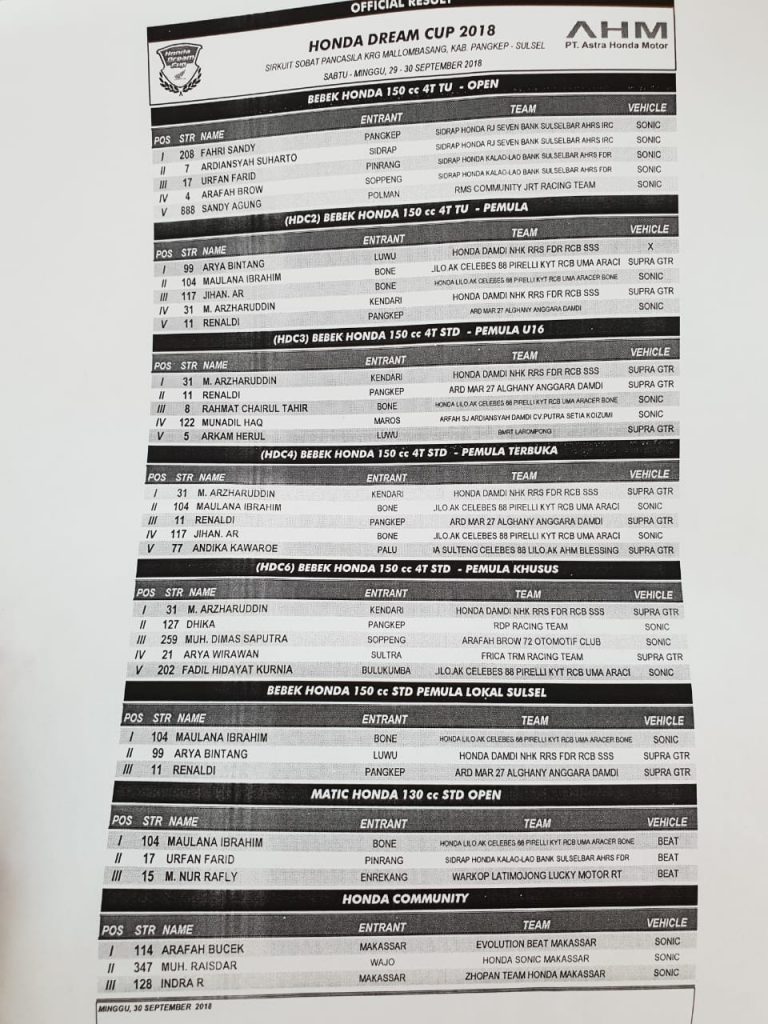 Hasil Balap Honda Dream Cup Seri Pangkep 2018