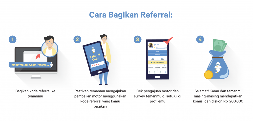 - Penerima referral harus mendaftar di Moladin dengan e-mail & nomor handphone yang digunakan saat mengajukan kredit motor.