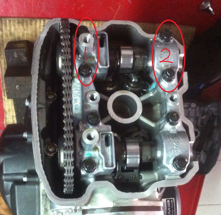 Sekarang coba bandingkan dengan mesin DOHC Suzuki diatas, tak tanggung-tanggung kedua camshaft diapit langsung oleh 3 pegangan dan pegangan yang paling mengurangi daya gesek adalah yang nomor 1 letaknya berada diujung camshaft, ini otomatis langsung mengurangi daya tarik kebawah rantai keteng sehingga daya gesek disemua titik pegangan cam sangat minim, kemudian daya dorong oleh loab lift cam ini langsung teredam dengan adanya 3 pegangan.