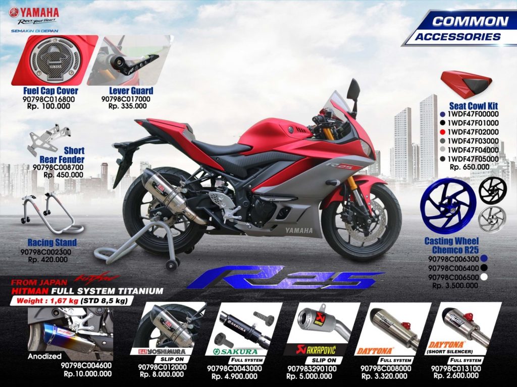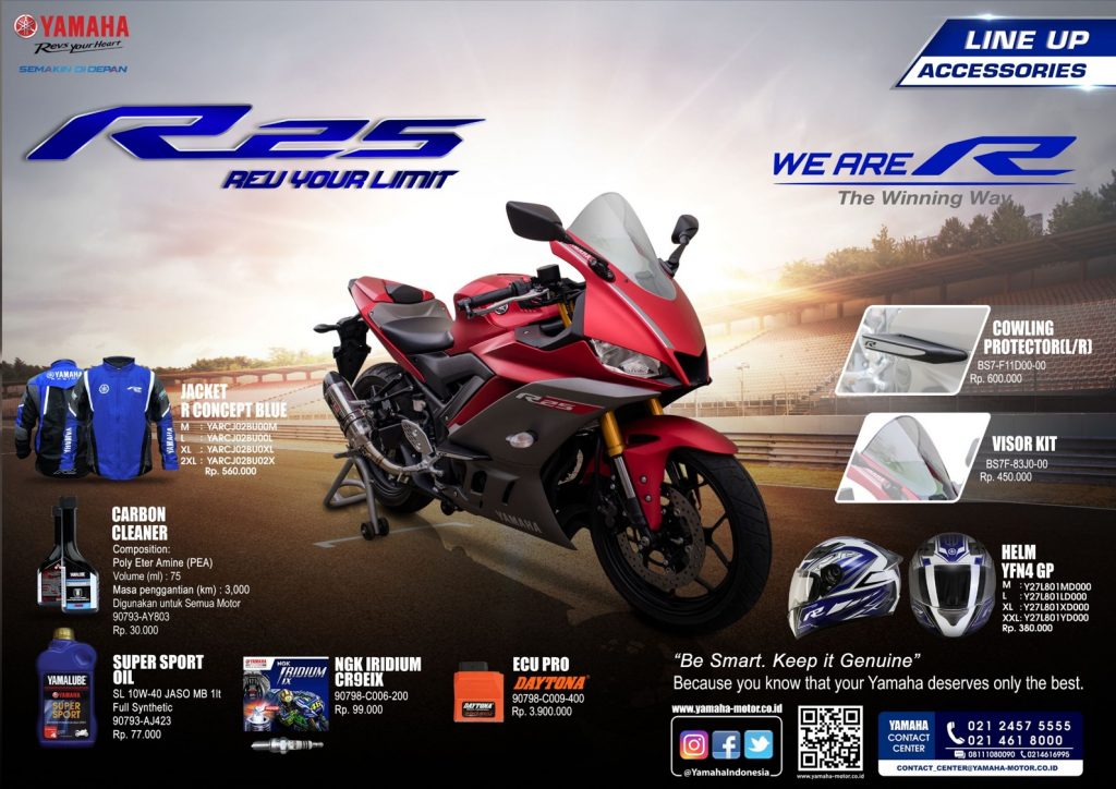 Beragam line-up aksesoris tersebut meliputi produk eksisting yang sebelumnya telah tersedia lebih dulu di pasar serta produk anyar yang kemunculannya menyusul atas kehadiran R25 generasi terbaru. Selain aksesoris, Yamaha Indonesia turut menyediakan apparel seperti jaket dan helm dengan desain lebih racy yang mengangkat tema R-concept. Untuk lebih detilnya, simak daftar aksesoris dan apparel produk New R25 berikut.